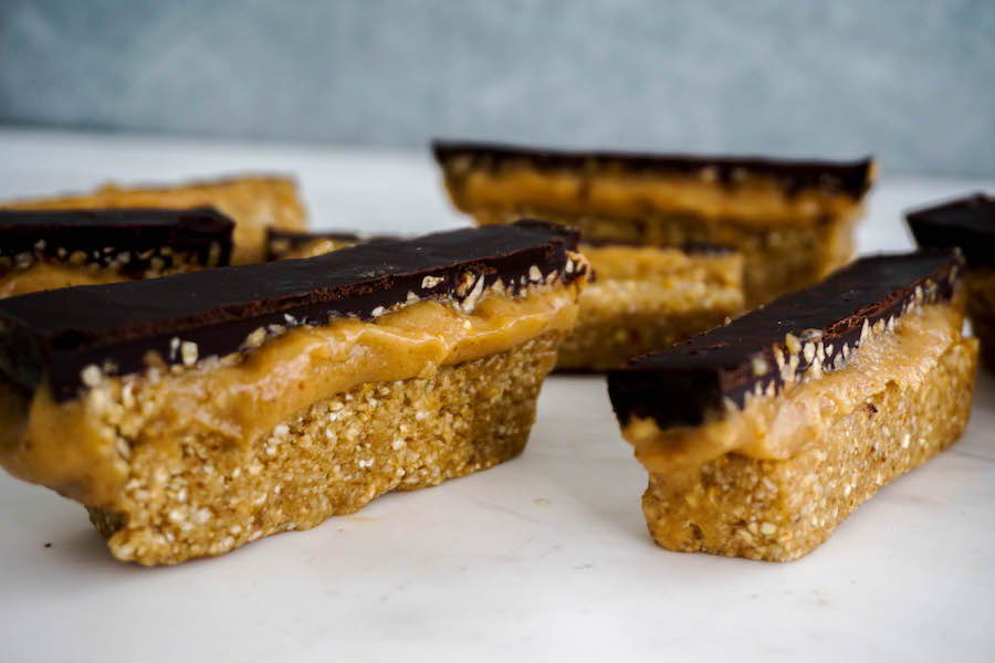 A crumbly oat base, sweet, sticky caramel filling and smooth rich chocolate coating with a crunch of peanuts sandwiched between the layers…