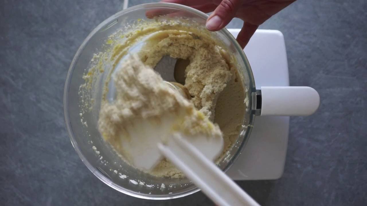 - Add macadamias and cashews to the food processor and blend until compeltely smooth. Then add the lemon juice and zest, maple syrup and cacao butter and blend again